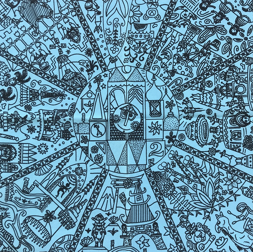 Fandanas are bandanas for fans of Disney attractions and characters. It all started with the “Tiki Room” Fandana I created in 2016 for fans of Walt Disney’s Enchanted Tiki Room. I hand drew everything, scanned in the drawings and arranged them in Photoshop. If you look closely at that design – and other early Fandanas – you can see the line thickness is not always the same because I enlarged and shrunk the various drawings after they were in Photoshop. When I’m working on a new design, I always print it out at actual size. This step ALWAYS leads to LOTS of changes as I have to constantly struggle to not add too many details or make things too small!